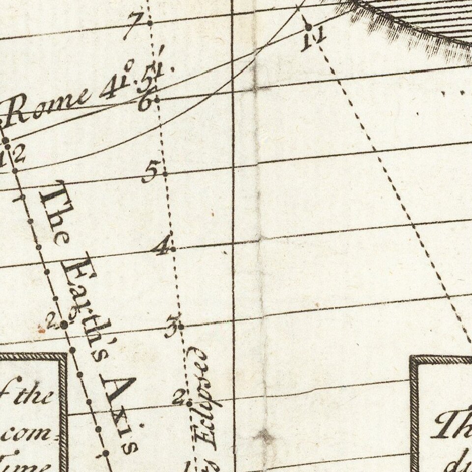 The broadside, published by John Senex, one of the only mapmakers to be named a Fellow of the Royal Society, shows a diagram of the earth (or the hemisphere of the earth with the sun’s light upon it) with only the lines of latitude and longitude shown. The earth’s axis, correctly tilted, runs down the middle, while the path of the moon’s center is marked with a dotted line. The diagram is drawn so that a viewer could calculate the time of the beginning and ending of the eclipse for Stockholm, London, Rome, or other European locations.