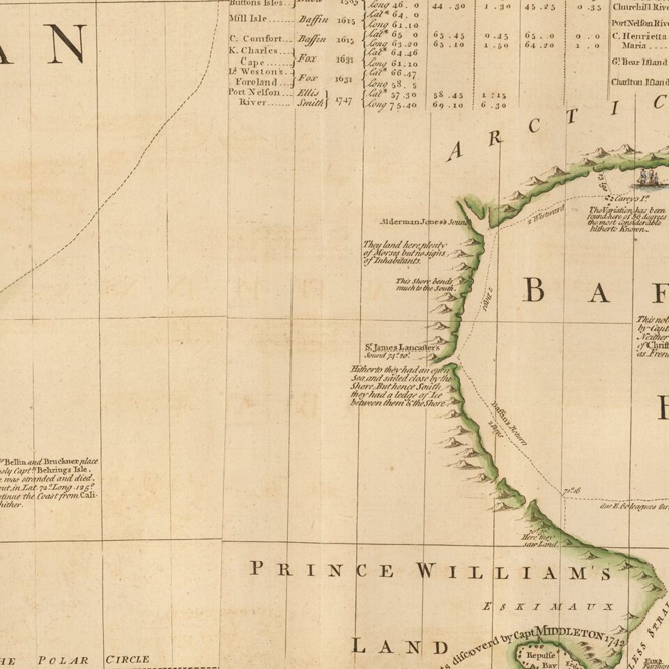Dozens of explorers' routes are plotted, with illustrations of at least 75 associated sailing vessels. The reason for including so many is explained in a note in the mid-Pacific, "These Tracks of Shipping are inserted to make known the Navigation of this Ocean and encourage the discovery of a Passage on this side Northwest." There are many other notes and commentaries surrounding Hudson and Baffin Bays, revealing Green's meticulous research and the careful additions of later editors.