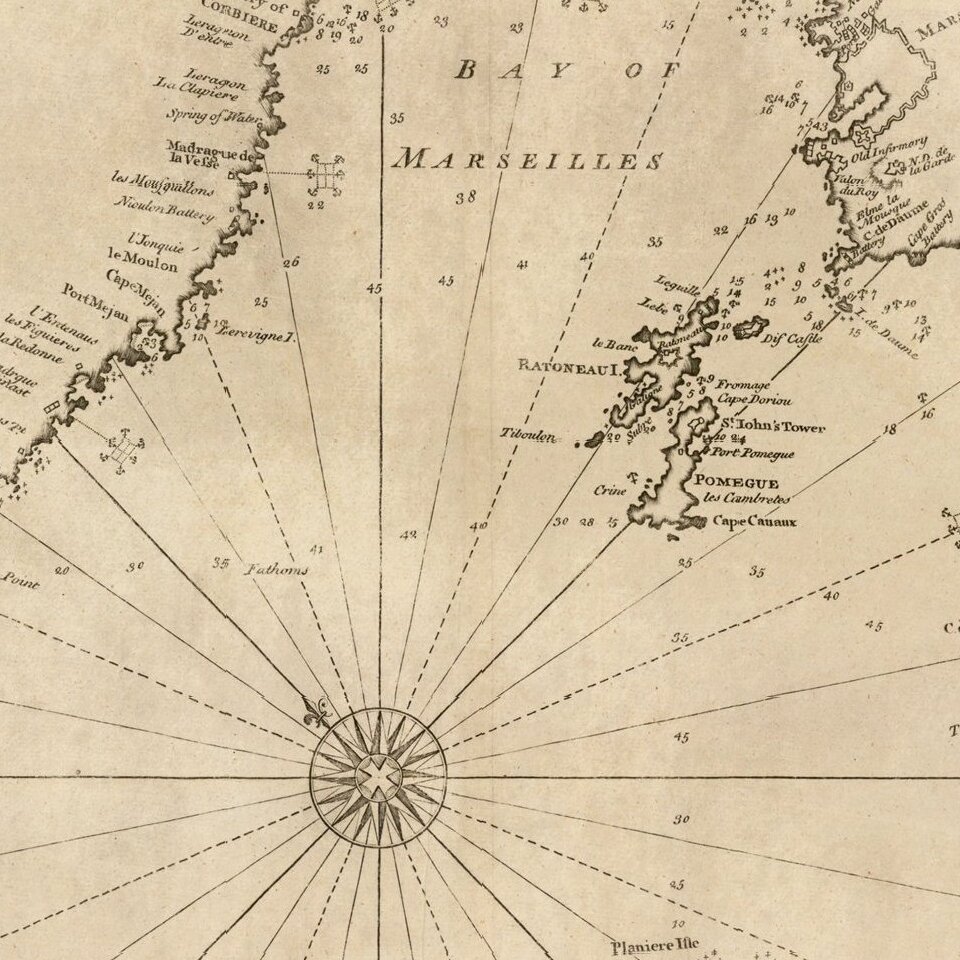 Striking chart of area around the Bay of Marseille, based the chart of the Marseilles region published in Henri Michelot and Laurent Bremond's Carte Generalle dele Mer Mediterranee.
