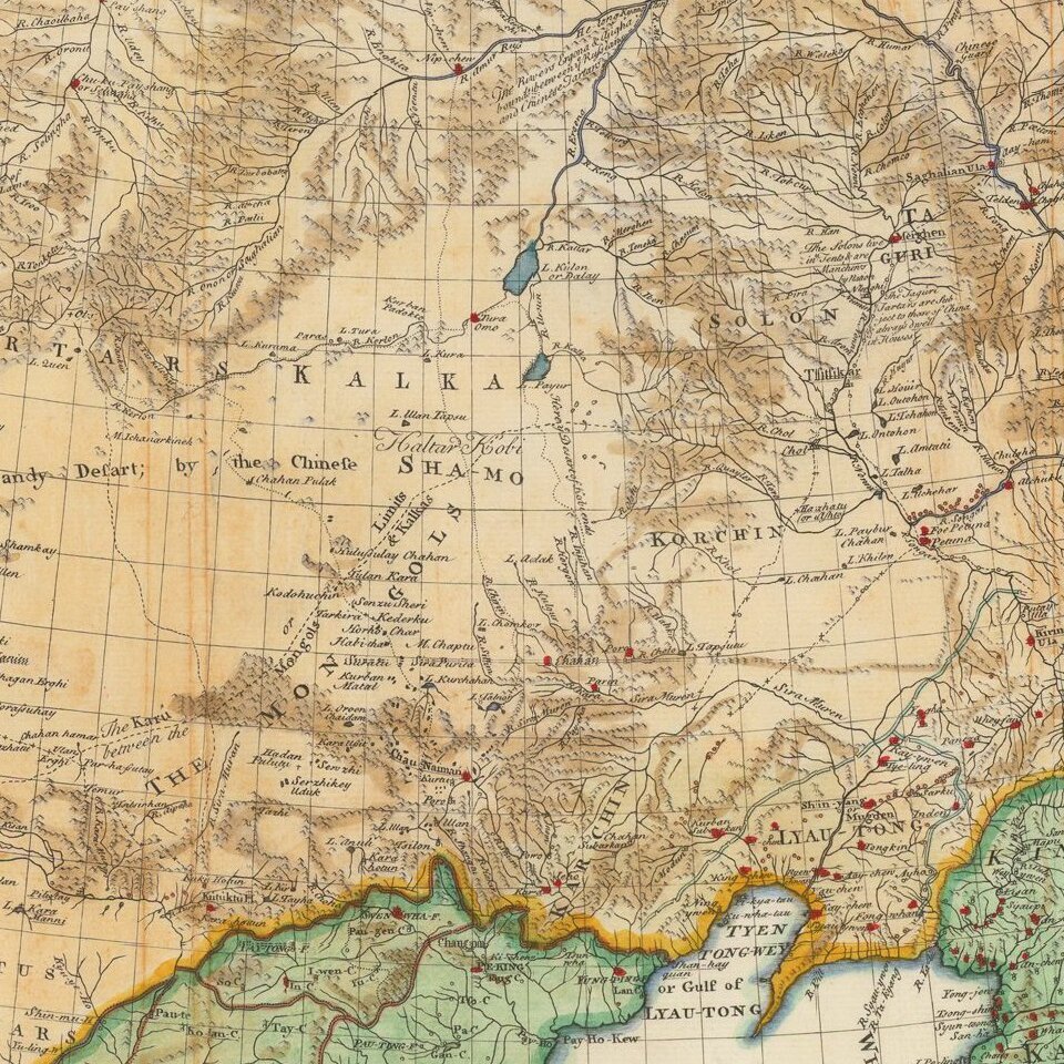 Fine example of D'Anville's map of the region from Korea to the Gobi Desert, centered on Mongolia and Korea. Highly detailed throughout. Engraved by Delahaye.