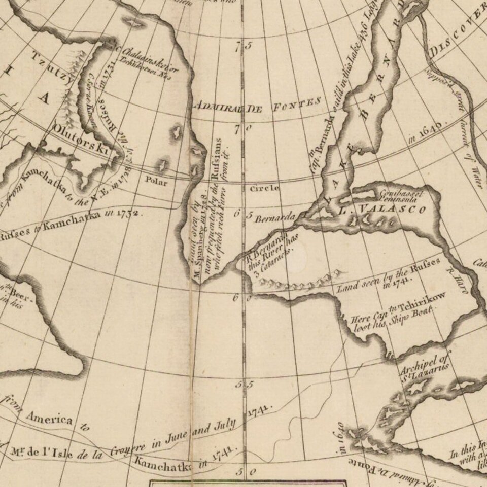 Includes tracks and notes from the voyages of Bernarda, Tchirikow, de Aguilar, de Fuca, Behring and various discoveries and dates referenced only as Russian. An essential map for Northwest Passage and Mer de l'Oest collections.