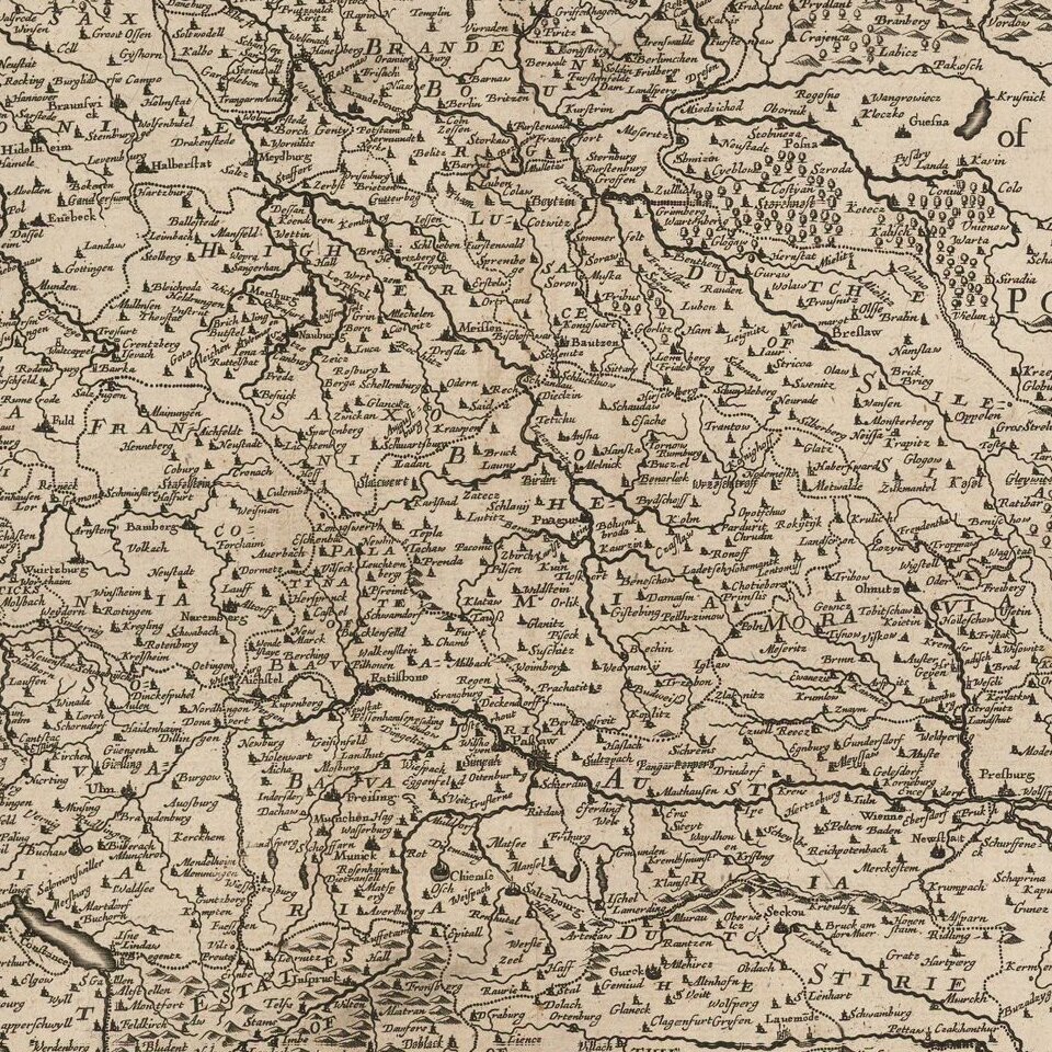 A striking dark impression of Richard Blome's scarce map of the German Empire, the earliest folio sized map of the region to be engraved in England.