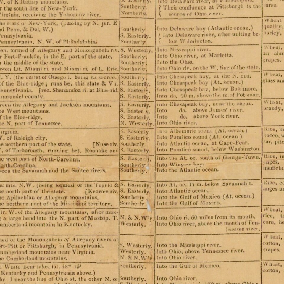 James Strong: A Geographical Chart of the American Federal Republic. Or, a comprehensive view of the most interesting particulars relative to the geography &c. of the United States of North America. Walpole, New Hampshire, 1806 (Advertised in the August 27, 1806, issue of the Vermont Centinel, Burlington, as "For sale at this office. - Chart in nineteen columns; printed area measures 45.6 x 54.1 cm. - Shaw & Shoemaker, 1371.) http://www.izaak.unh.edu/dlp/Stark/Broadsides/pages/1800-geochart.htm