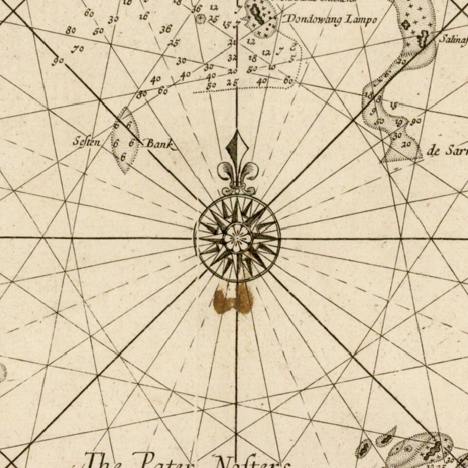 In 1671, the London cartographer John Seller (fl.1664-97) commenced work on The English Pilot, a work that intended to challenge Dutch hegemony in the sea atlas market. Intended to be published in four books covering different regions of the globe, Seller published an uncompleted book on 'Oriental navigation' in 1675. Unable to continue this herculean endeavour, Seller sold his rights to John Thornton, the official hydrographer to the English East India Company. Thornton took up the project with great fervour, publishing his first editions in 1689. Thornton did not publish his first edition of the Third Book, detailing navigation in the East Indies, until 1703. While Thornton largely based his charts on those of earlier Dutch cartographers, most notably those found in Pieter Goos' Zee-Spiegel and Lucas Janz Waghenaer's Mariner's Mirror, The English Pilot proved to be enormously popular.