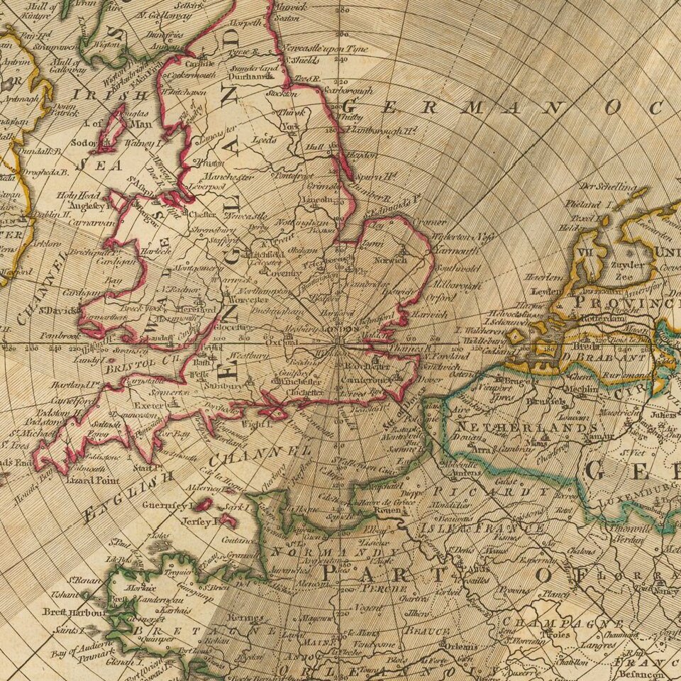 Rare, separately-issued map showing the solar eclipses of 1715, 1724, 1737, 1748 and 1764, including the famous 1715 Halley’s Eclipse, named for the pioneer of eclipse mapping, astronomer Edmond Halley.