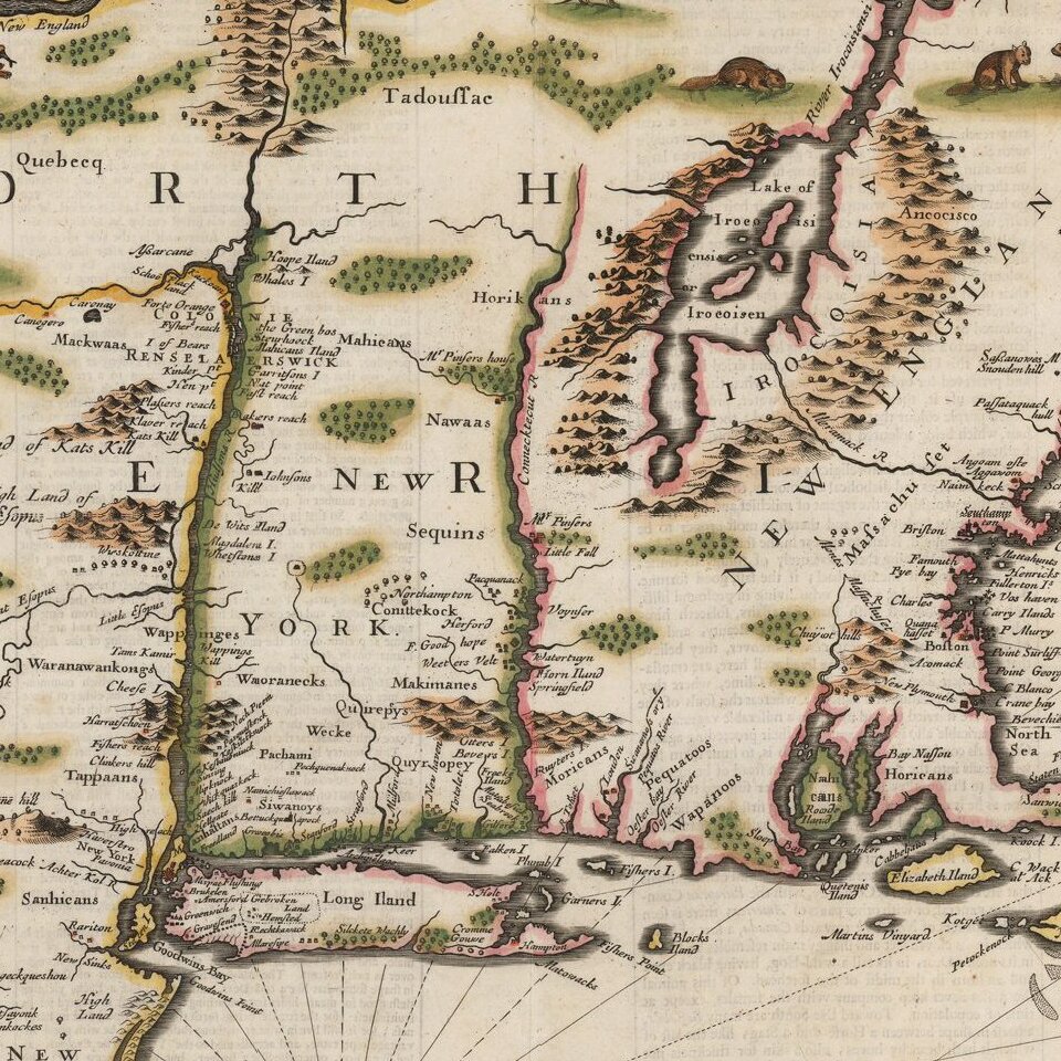 One of only a small group of English maps of New England, prior to 1700. Based on Jansson's map of 1651, it illustrates the territories acquired by the British with the capture of New Amsterdam in 1664, which radically adjusted the landscape of North American politics. While the map's geographical features are largely drawn from Jansson, the map's nomenclature is substantially anglicized, including the first appearance of the name Boston (omitted from the Jansson maps), and the use of the names New York and Cape Cod.