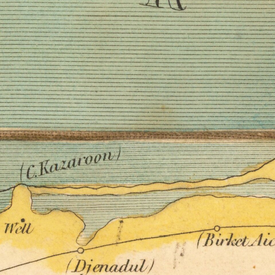 An ancient canal between the Salt Marshes of the Red Sea and the Gulf of Suez is shown along with a note "Vestiges of Suez Canal", a reference to Napoleon's attempt to construct the Suez Canal, as well as a proposed railroad from Cairo to the north point of the Suez Canal.