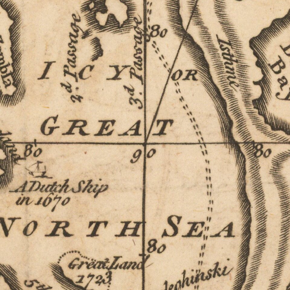 The map includes notes on Dutch, Portuguese and English discoveries near the North Pole. A very definite route from Japan to Portugal is shown, snaking around the apocryphal island of Jeso, or Yesso. The map shows the West Sea, a version of the mythical Sea of the West, which tentatively connects to another large inland lake which, in turn, connects, via dotted lines to Hudson's Bay. Perhaps the most salient feature of the map is the suggestion that there is no indication of any land masses or obstructions near the poles. All in all, these features highlight the importance of the ever elusive, and therefore appealing, Northwest Passage to eighteenth-century readers.