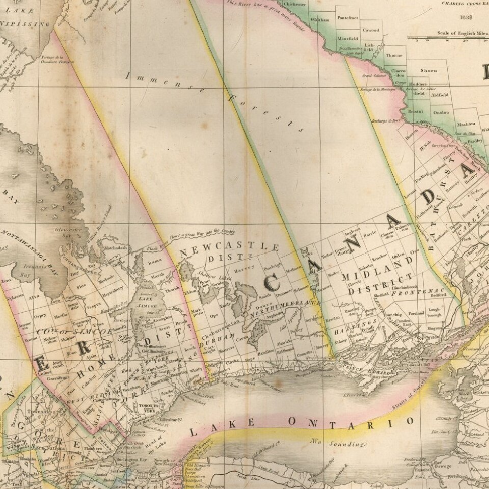 Fine map of Upper Canada, showing detailed information on the counties, districts, townships, transportation systems, place-names and northern Ontario ('Great Tract of Wilderness') &c. It also includes portions of Quebec, Michigan Territory, New York, Pennsylvania. The 1838 issue includes additional rivers, lakes, place-names, roads and a railway from London to Hamilton.
