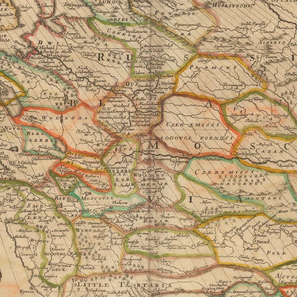 Old color example of Richard Blome's scarce map of Russia, the earliest folio sized map of the region to be engraved in England.