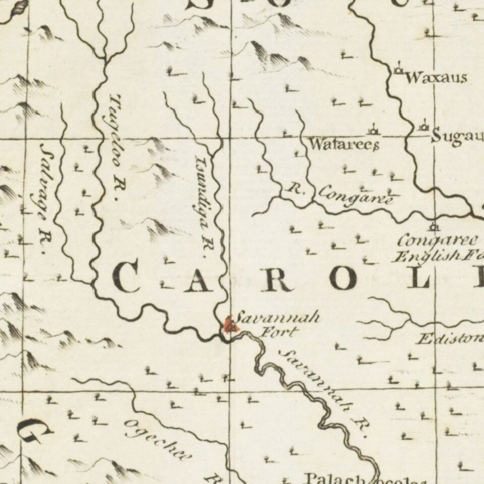 Striking example of Bowen's detailed map of the Carolinas, Georgia and most of Florida, extending west to the Country of the Cherokees and French Louisiana.
