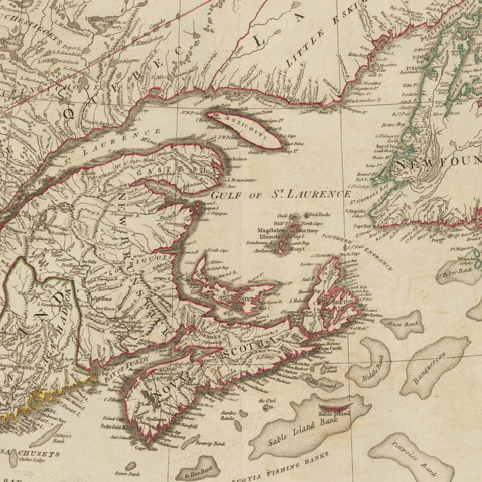 The note below the cartouche explains the control of various strategic fishing islands off the coast of Newfoundland, etc.
