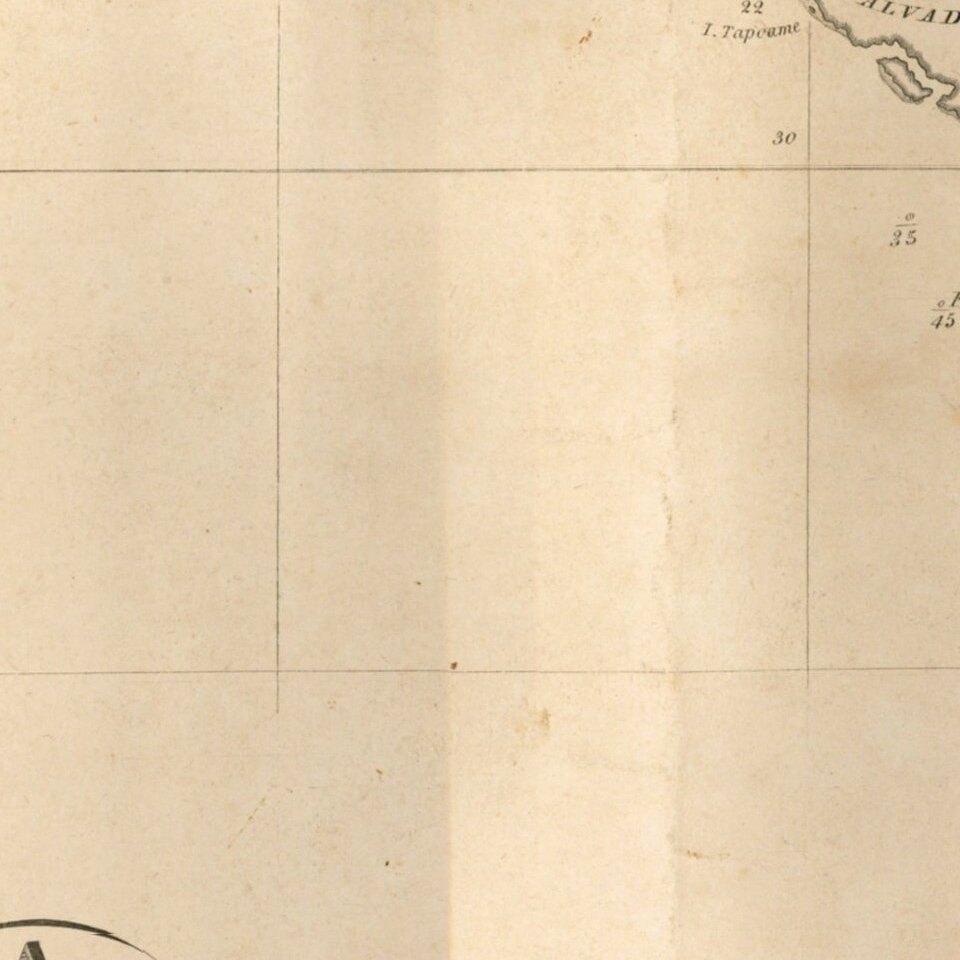During the first half of the 19th Century, both British and American mariners were making frequent visits to Brazil's ports and sailing along its coastlines. Britain was a longtime ally of Portugal and maintained extensive trade links with ports such as Rio de Janeiro and Bahia. Vessels of the Royal Navy also frequently reprovisioned in Brazil before and after rounding Cape Horn. Meanwhile, American whalers, mainly based in New England, were continually sailing to the South Atlantic and South Pacific Oceans, by way of Brazil. This chart would have been very useful during its time, as it would have been the first accurate general chart of Brazilian waters available to American shipping. As the British had superior access to Portuguese surveys and a more developed chart publishing industry, it was natural for American chartmakers to copy groundbreaking British publications.