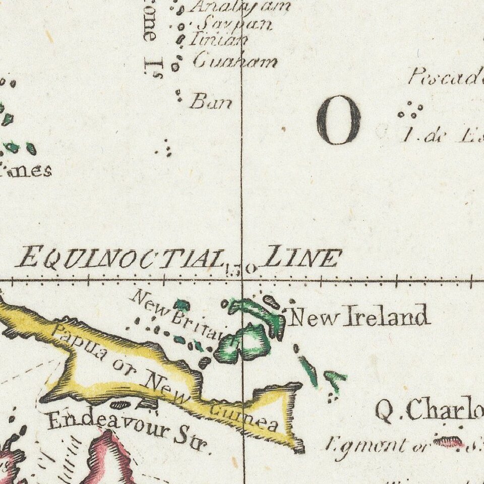As the title indicates, the findings of several recent voyages contributed to this chart. These include Dampier, the Dutch East India Company’s ships, and Cook, but also Francis Drake, who circumnavigated in 1577-80. George Anson’s voyage is also mentioned; he led a circumnavigation expedition from 1740-44.