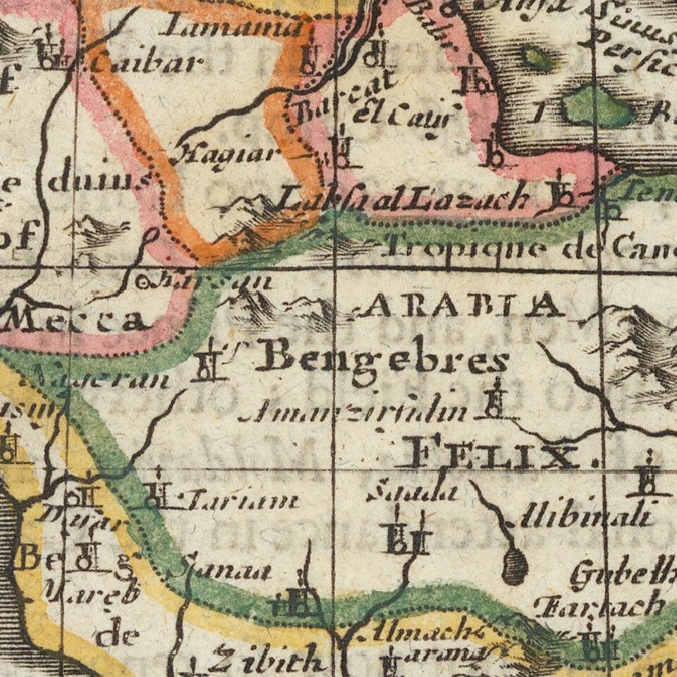 Rare early English map of Arabia, extending from the Mediterranean to the Red Sea to the Persian Gulf, with many kingdoms, place names, etc. shown.