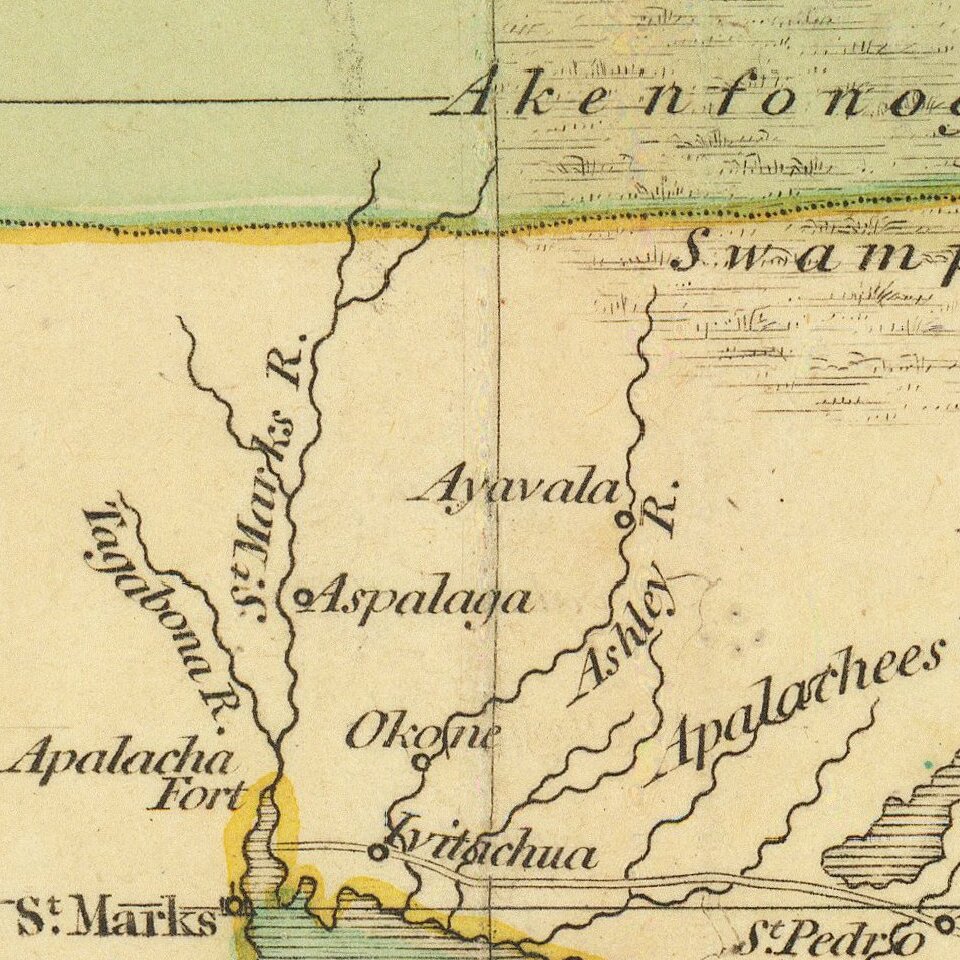 The map provides an excellent treatment of East and West Florida, the latter of which was still under Spanish control until 1812, although claimed as part of the Louisiana Purchase in 1803. In Florida, Fort St. Marks, Apalacha Fort, and the roads across from St. Augustin are shown, with a note that the Apalachees Villages are now deserted. Southern Florida is Ancient Tegesta and The Promontory. A Lake and River system connects Mayaco Lake with the St. Johns River.