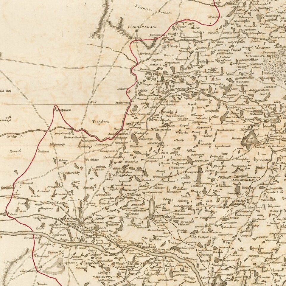 The map also extends inland, centered on the course of the River Palar, Paliar or Palaru (or Milk River).
