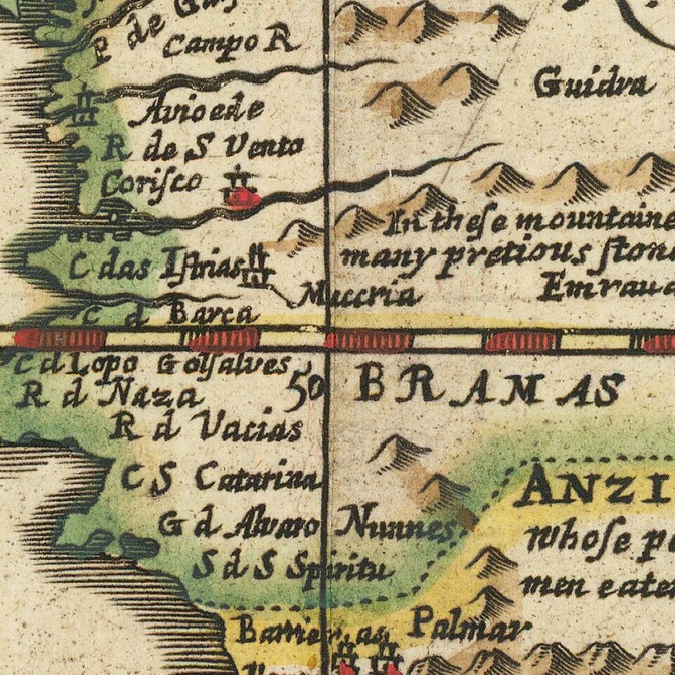 Despite this sad history, this map is clearly focused on the trade of goods rather than people. The various notes around the map indicate where to find gold, emeralds (Emrauds), and aloe (Aloes), among other goods.