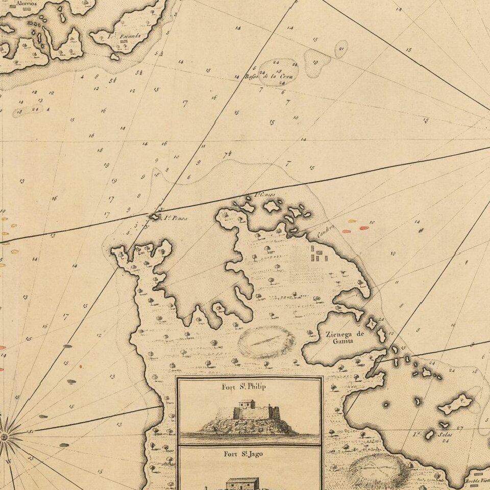 The present map is an exceptional example of mid-18th century English cartography. The elaborately-engraved cartouche in the upper left and scale of miles in the upper right are characteristic of the great maps of the day. The map is replete with additional inset views of the city as a whole ("Prospect of the City of Carthagena, Bearing NNW"), Fort St. Philip, Fort St. Jago, Fort Cambia, Bocca Chica, or Castle St. Louis, Fort St. Joseph, Castle Grande.