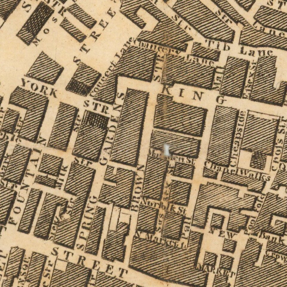 Unlike the modern plans of Manchester, it is drawn with the north at the bottom; so that Salford is represented on the right, Ancoats on the left, Knott Mill and Oxford Road at the top, and Strangeways, &c., at the bottom. The old streets and the old names are here delineated and preserved. Taking one main thoroughfare, we have Market Street Lane, Lever's Row (from Mosley Street to Portland Street), Piccadilly (from the latter to Lees and Gore Streets), Shooter's Brow (from Lees Street to about Store Street), Bank top (thence to Granby Row), London Place (from Granby Row to Ardwick Bridge), and Downing Street (from the bridge to Ardwick Green). The six names are now comprised in four, Market Street, Piccadilly, London Road, and Downing Street. In Oxford Road there were then only two houses between St. Peter's Church and the Rochdale canal; several of the churches were in the midst of gardens or waste ground, as St. George's, Rochdale Road; St. Michael's, St. Peter's, and St. Stephen's, Salford. Hulme had only a belt of buildings on both sides of Deansgate to Knott Mill; Water Street, beyond Quay Street, had only buildings on the side next the river.