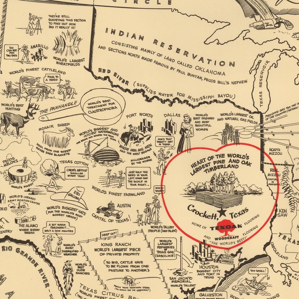 Fascsinating Pictorial Map of Texas, drawn by Dallas illustrator Frank Oliver for the Texoak Flooring Company of Crockett, Texas, "Honest-to-goodness Texans who manufacture."