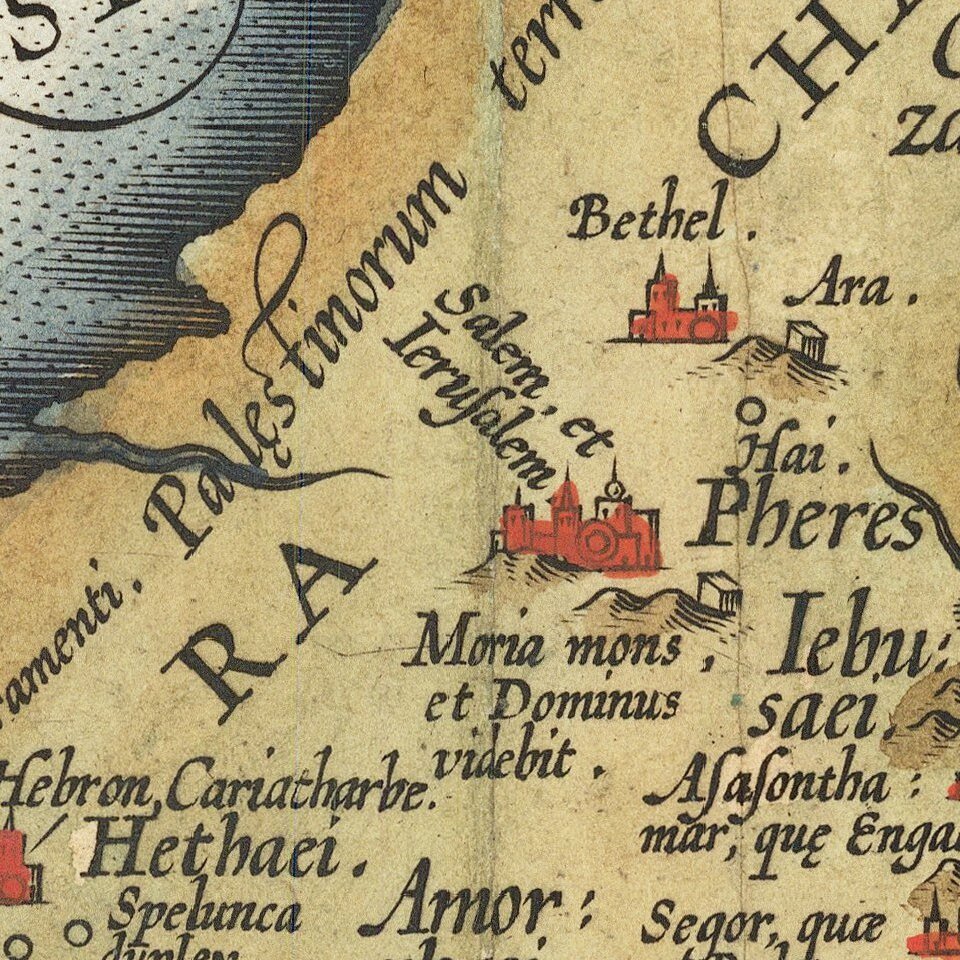 The Wanderings of Abraham is among Oretelius' most elaborate productions. It demonstrates his combined talents as mapmaker, artist and historian. This is one of the few ancient maps produced by Ortelius himself, and is decorated with 22 medallion vignettes showing the history of Abraham's life. The map is based upon the Geography of the Holy Land at the time of Abraham's life.