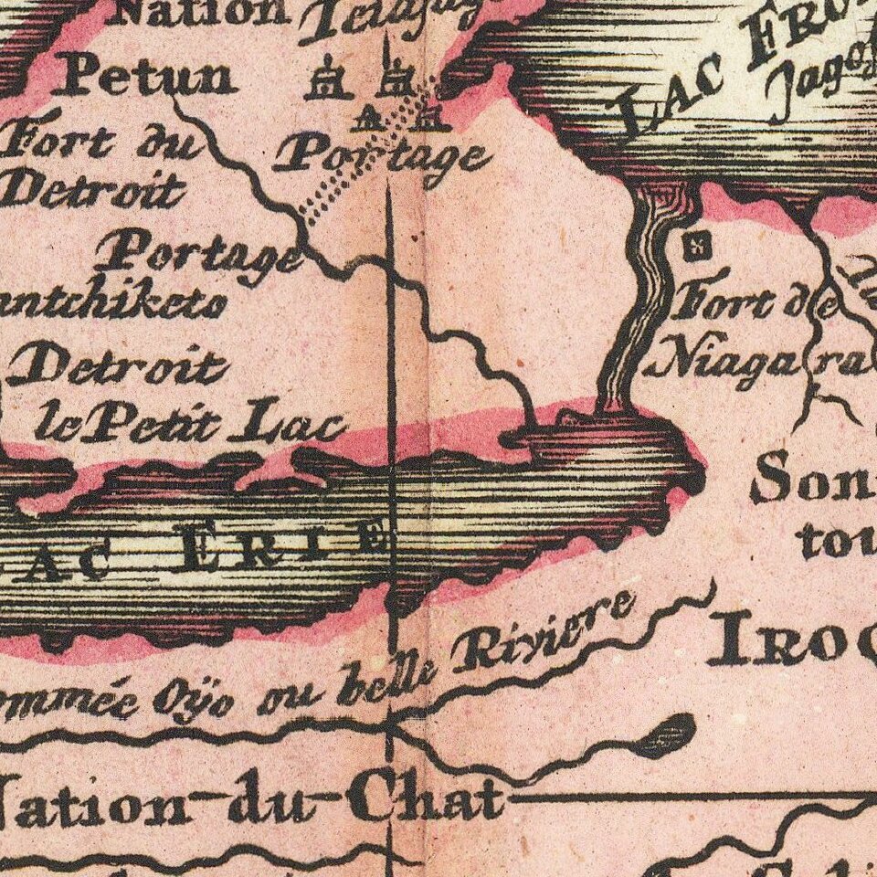 Perhaps the most interesting feature of the map is the elaborate title cartouche. It depicts an allegorical, satirical scene of the infamous Mississippi Bubble investment scheme with a female personification of the Mississippi River pouring jewels and riches forth, while she is perched precariously upon a bubble. Cherubs above the cartouche are issuing stock for the company, and another group is blowing bubbles in the foreground surrounded by piles of worthless stocks. In the background, desperate investors climb a small tree and fling themselves out of it, and in the foreground more disconsolate investors wail and bemoan their fates as one tries to impale himself on his sword. Above them, a cherub upends an empty money-bag.