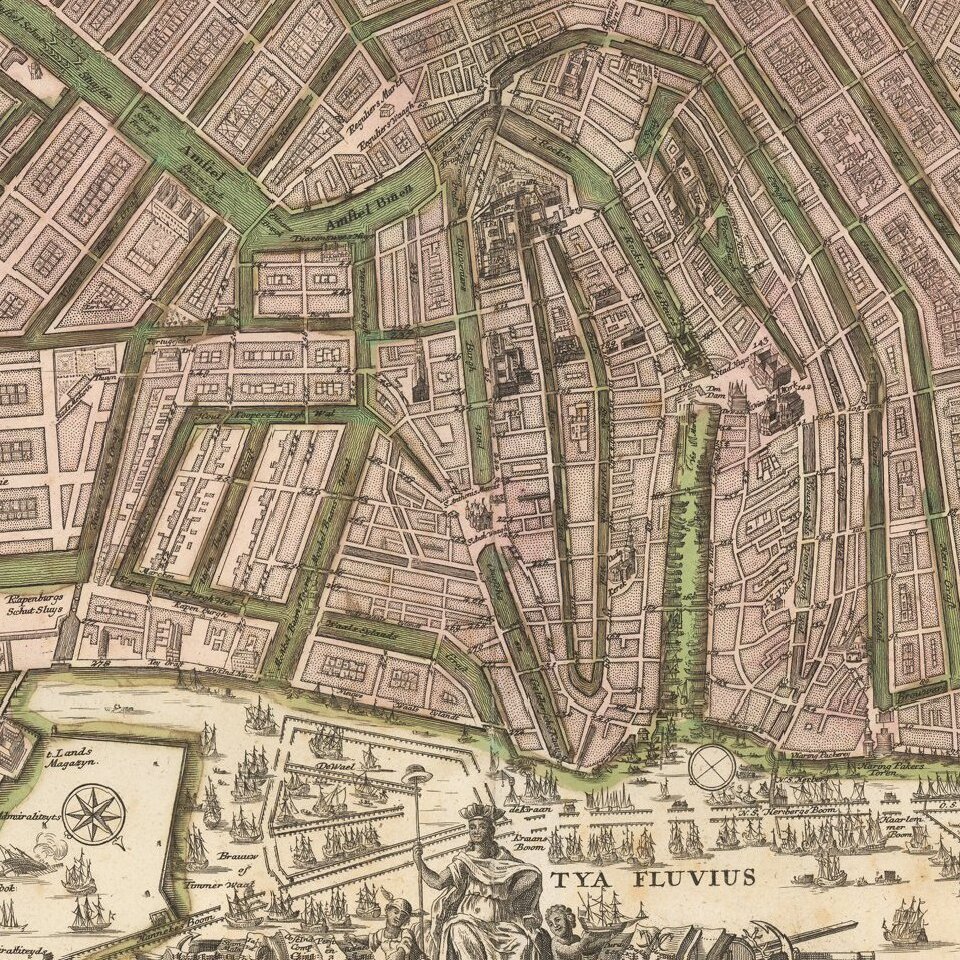 Amsterdam is shown after its period of explosive growth during the late 16th and 17th centuries, which saw it grow from a small port town to one of the most important centers of commerce and finance in Europe.