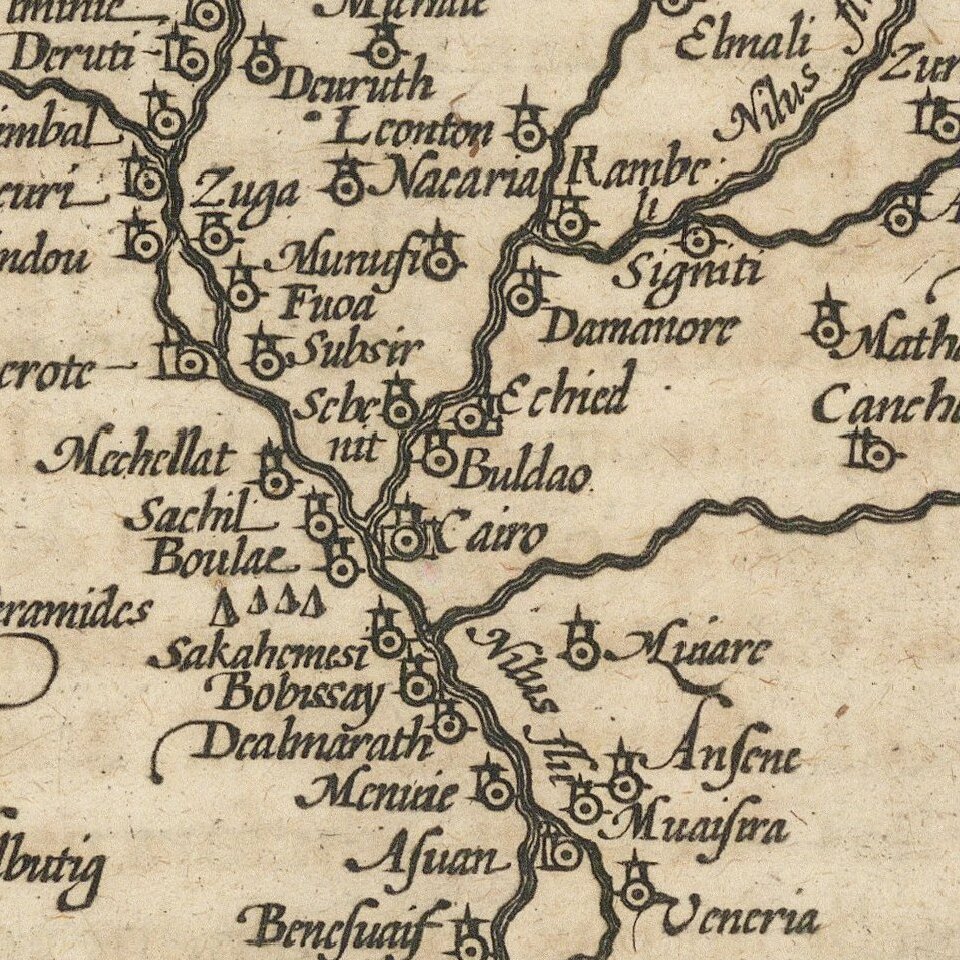 Nice example of this early state of Barent Langenes's map of Egypt and the Nile, which first appeared in the 1598 edition of Langenes's Caert-Thresoor, published in Middelburg.