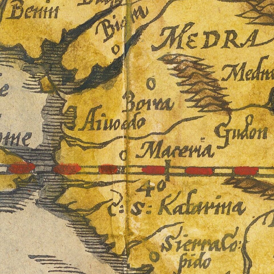 Sixteenth century mapmakers, including Waldseemüller and Münster, chose to follow the Ptolemaic model. This was typical of cartographers at the time, who had abandoned Ptolemy’s coastlines in favor of the more recent Portuguese outlines yet who also clung to Ptolemaic place names for the interior of Africa well into the nineteenth century.