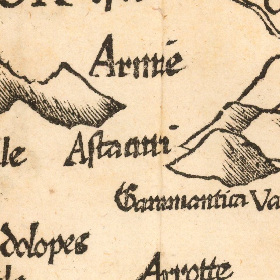 While information about the African coast was available to sixteenth-century mapmakers like Fries thanks to Portuguese exploration, little was known about the actual geography of the continent’s interior. Indeed, few Europeans would travel beyond the coastal regions until the mid-nineteenth century. Fries retains Ptolemy’s account of the area, sourced from Roman military expeditions in the first and second centuries AD, as well as from the Phoenician geographer Marinus of Tyre and, likely, from traders and merchants. He also includes important geographic hypotheses and fables of the time, like the Mountains of the Moon and the kingdom of Prester John.
