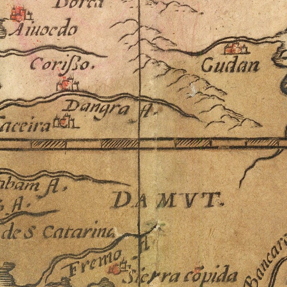Gastaldi lived in Venice and had collaborated with Ramusio on his famous travel collection, which gave Gastaldi access to the latest geographic knowledge. In his important, yet not widely distributed, 1564 map of Africa, Gastaldi corrected the southwest coast, which was typically sloped too steeply. He also introduced a novel depiction of the sources of Africa’s rivers, which will be discussed below. Finally, he drastically increased the number of place names included: 655 names along the coast and a whopping 1200 in the interior.