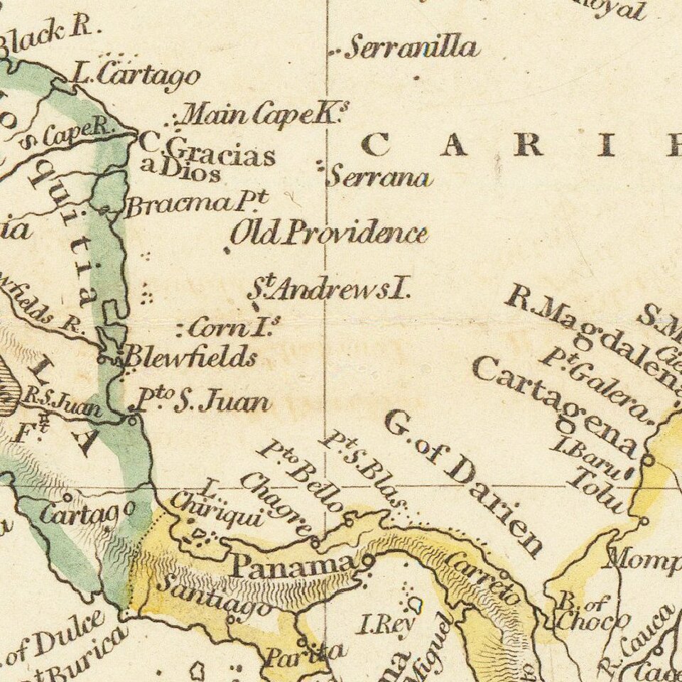 Boundaries have changed much since the making of this map. The Canadian-American border west of the Rocky Mountains is not drawn, though Canada does extend to the Columbia River along the coast. Texas is massive and part of Mexico, though it should have been independent at the time. Guatemala occupies much of Central America. The Gran Columbian dream is on its last legs, with three different republics all faintly demarcated. In reality, they were already independent states. Bolivia reaches the ocean, and the War of the Pacific has yet to be fought to lengthen Chile.
