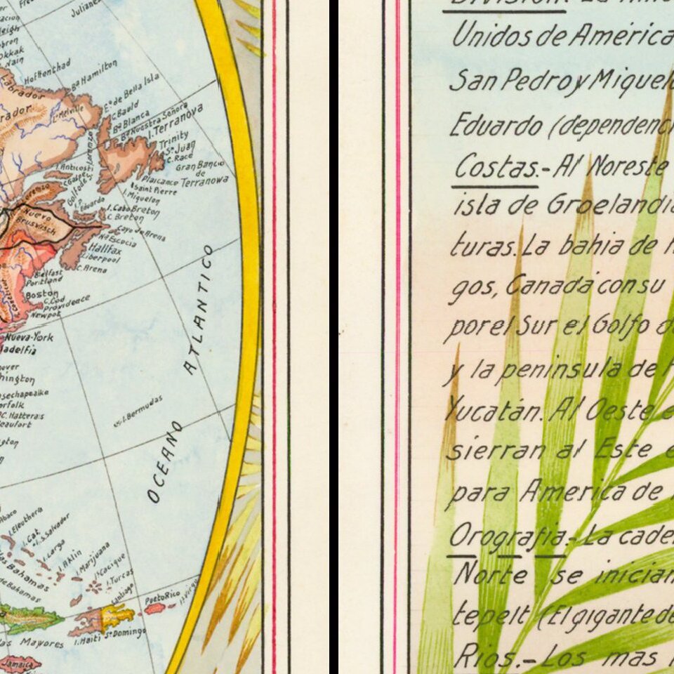The map shows a finely illustrated map of North America, with a fact card superimposed over a flora motif.