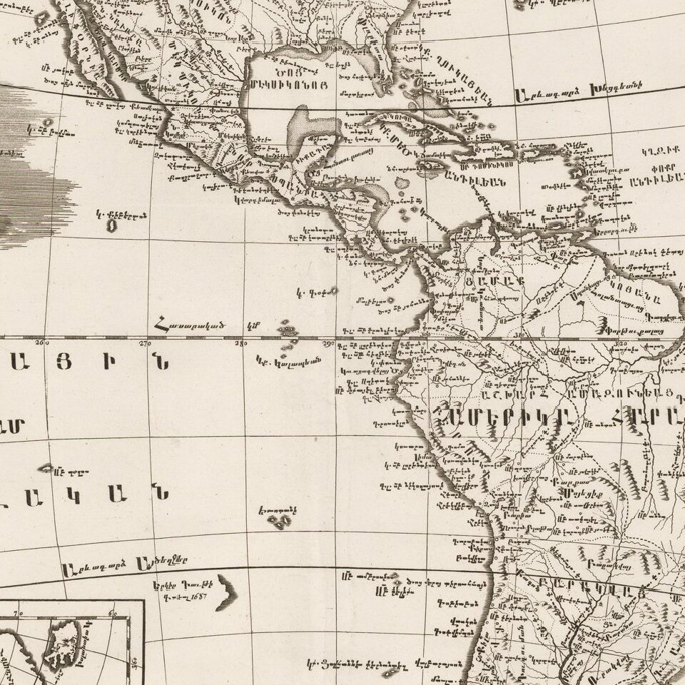 Among the many works published by the Mekhitarist fathers of San Lazzaro, were maps and geographical studies. This map of the Americas is part of a set of four continental maps by Elia Endasian, produced at the San Lazzaro press in 1786-87. The cartography is largely based on earlier works by Italian mapmakers, but the place-names and the map legends are in Armenian.