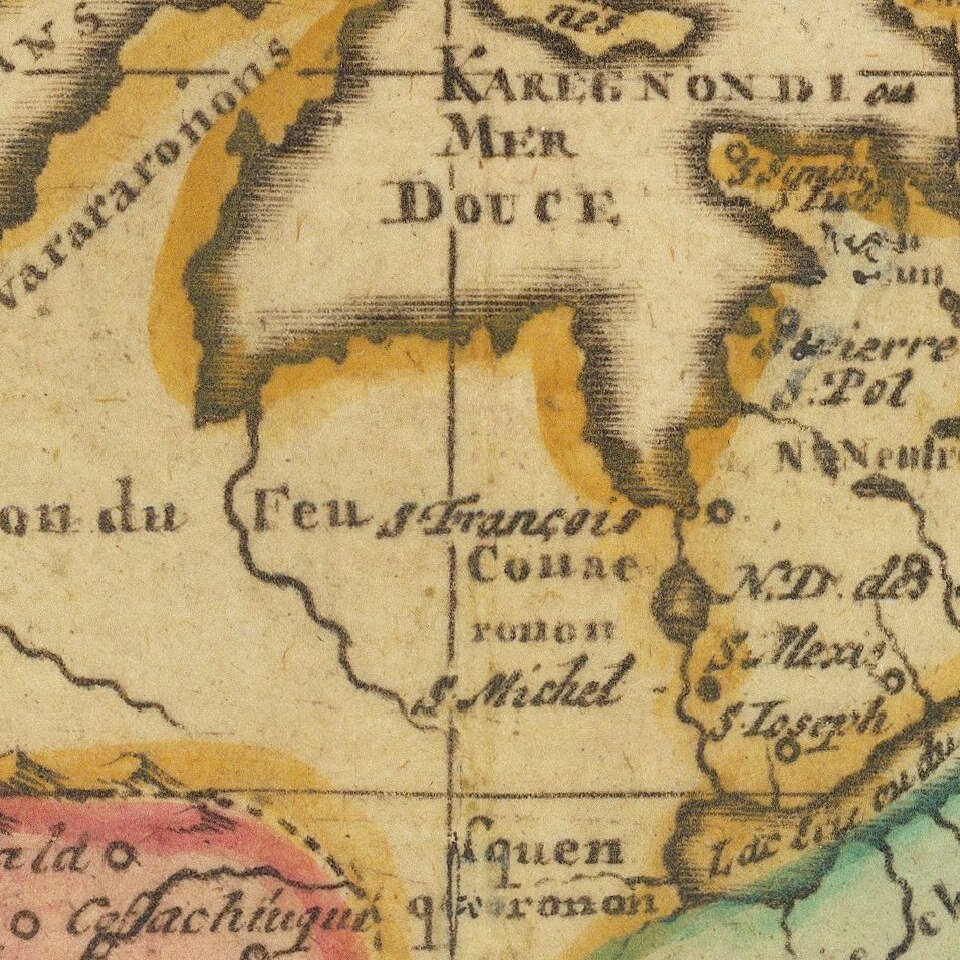 The map is a scarce derivative of Sanson's 1656 and Jaillot's 1676 maps. California is now a peninsula. The Great Lakes are closed at the western ends, unlike the earlier versions of the map.