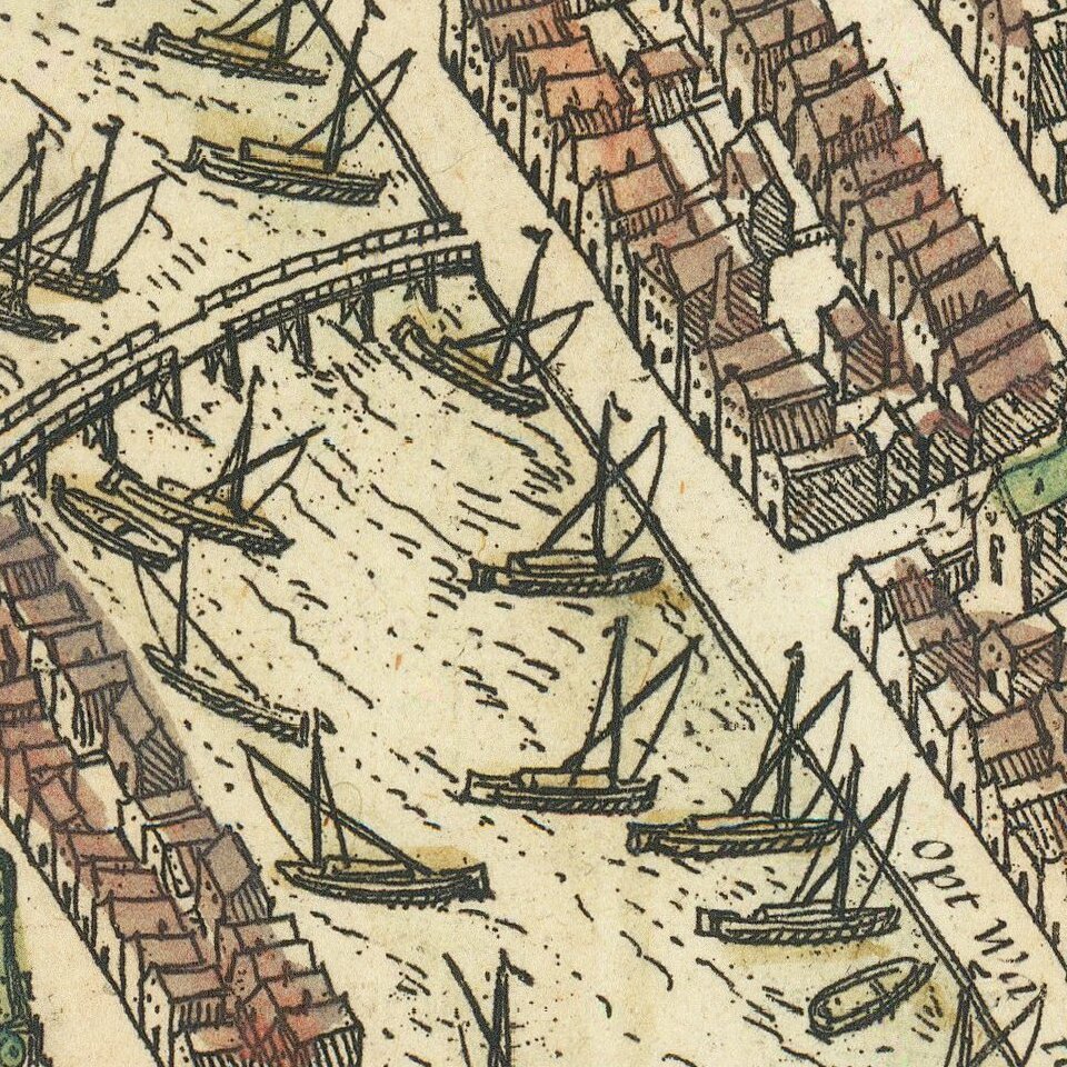 Braun & Hogenberg's view is based upon a plan of Amsterdam by Cornelis Antoniszoon (1544), showing Amsterdam with its medieval walls and formal defensive systems. The view illustrates the unique Dutch form of urban planning. Here, the Amstel River is dammed near its mouth and its flow controlled by channels to the sea. An outer harbor is created from the downstream portion and an inner harbor is made from the upstream portion. The dam, located at the center, also provided the central plaza for public buildings. Numerous ships and fishing boats fill the harbors, attesting to the increased trade and commerce that Amsterdam was beginning to experience when this plan was published.