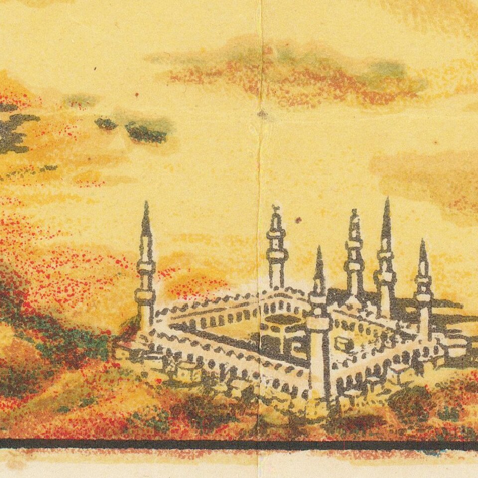 Color-lithographed map of the Middle East as one great Arab kingdom, with the Royal Navy and British merchant vessels sailing in the Red Sea and the Mediterranean.