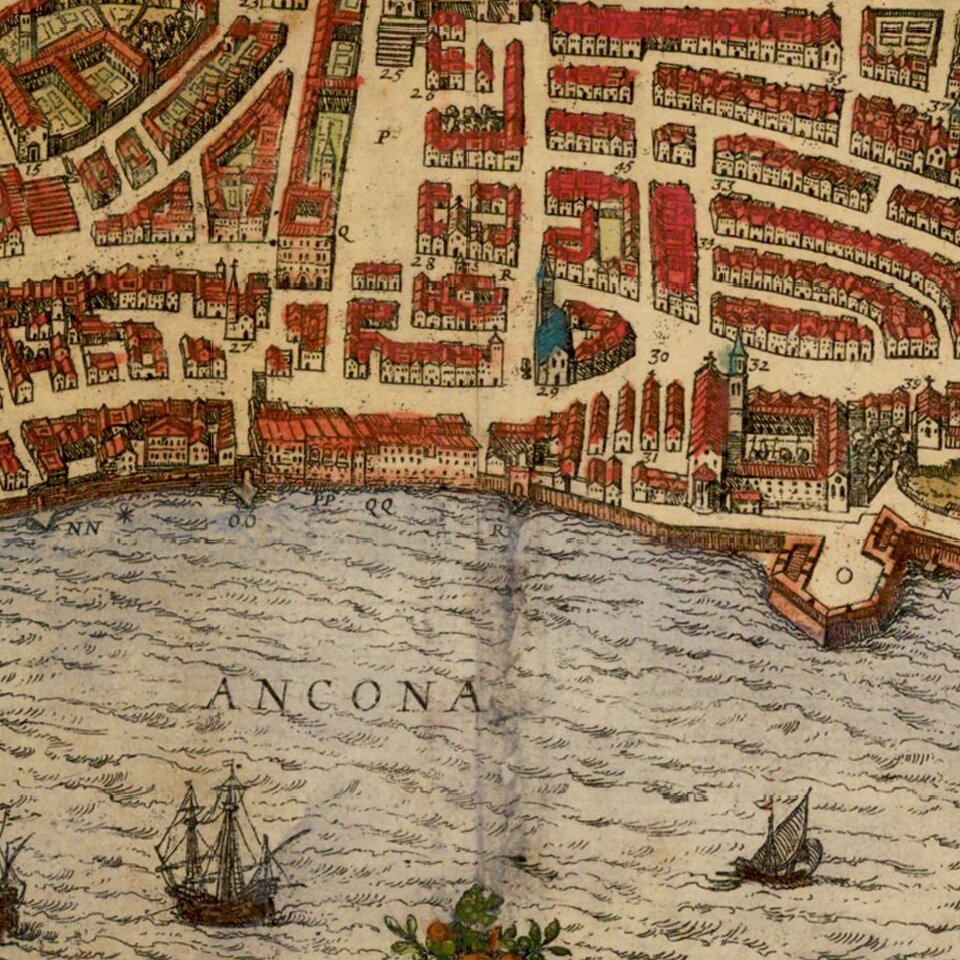 A fine early view of Ancona in the Marche region of Italy, published by Braun & Hogenberg in their monumental 6 volume Civitatus Orbis Terrarum.