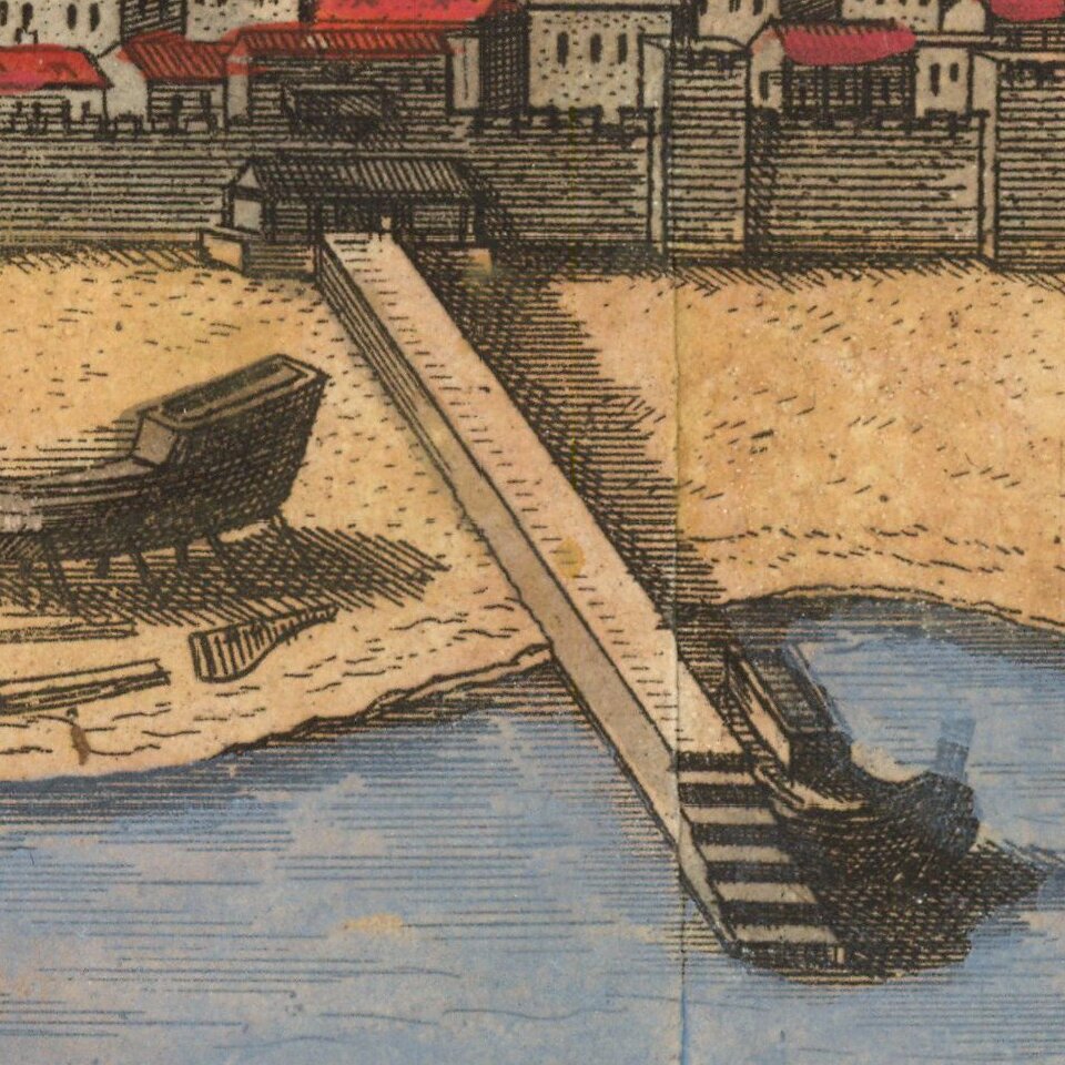 Georg Braun (1541-1622) was born and died in Cologne. His primary vocation was as Catholic cleric; he spent thirty-seven years as canon and dean at the church St. Maria ad Gradus, in Cologne. Braun was the chief editor of the Civitates orbis terrarum, the greatest book of town views ever published. His job entailed hiring artists, acquiring source material for the maps and views, and writing the text. In this role, he was assisted by Abraham Ortelius. Braun lived into his 80s, and he was the only member of the original team to witness the publication of the sixth volume in 1617.