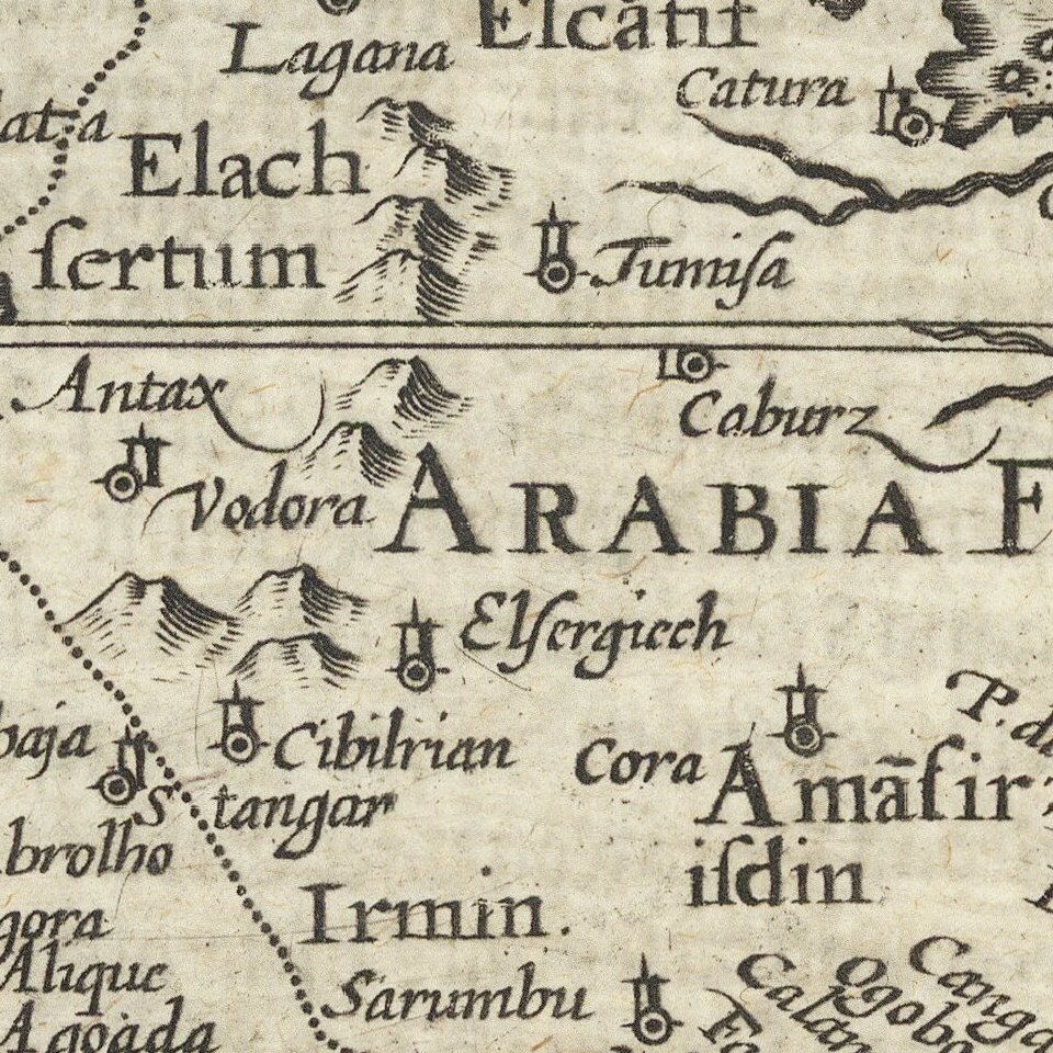 Nice example of this early state of Langenes / Bertius map of the Arabian Peninsula, which first appeared in the 1598 edition of Langenes's Caert-Thresoor, published in Middelburg.