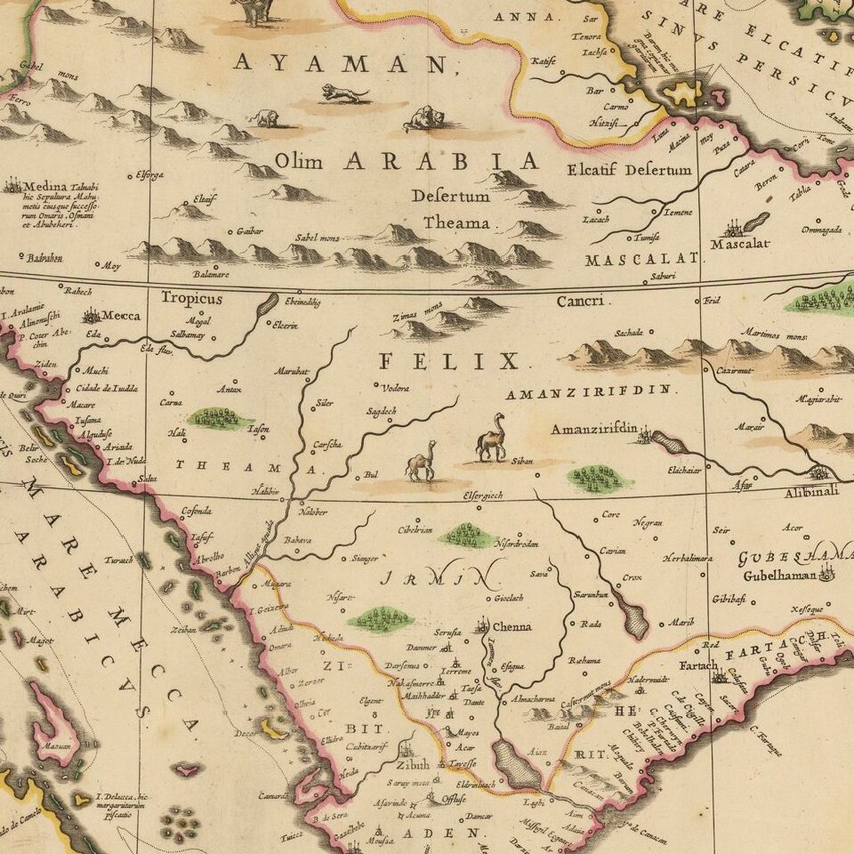 One of the most decorative of all 17th Century large format maps of Saudi Arabia.