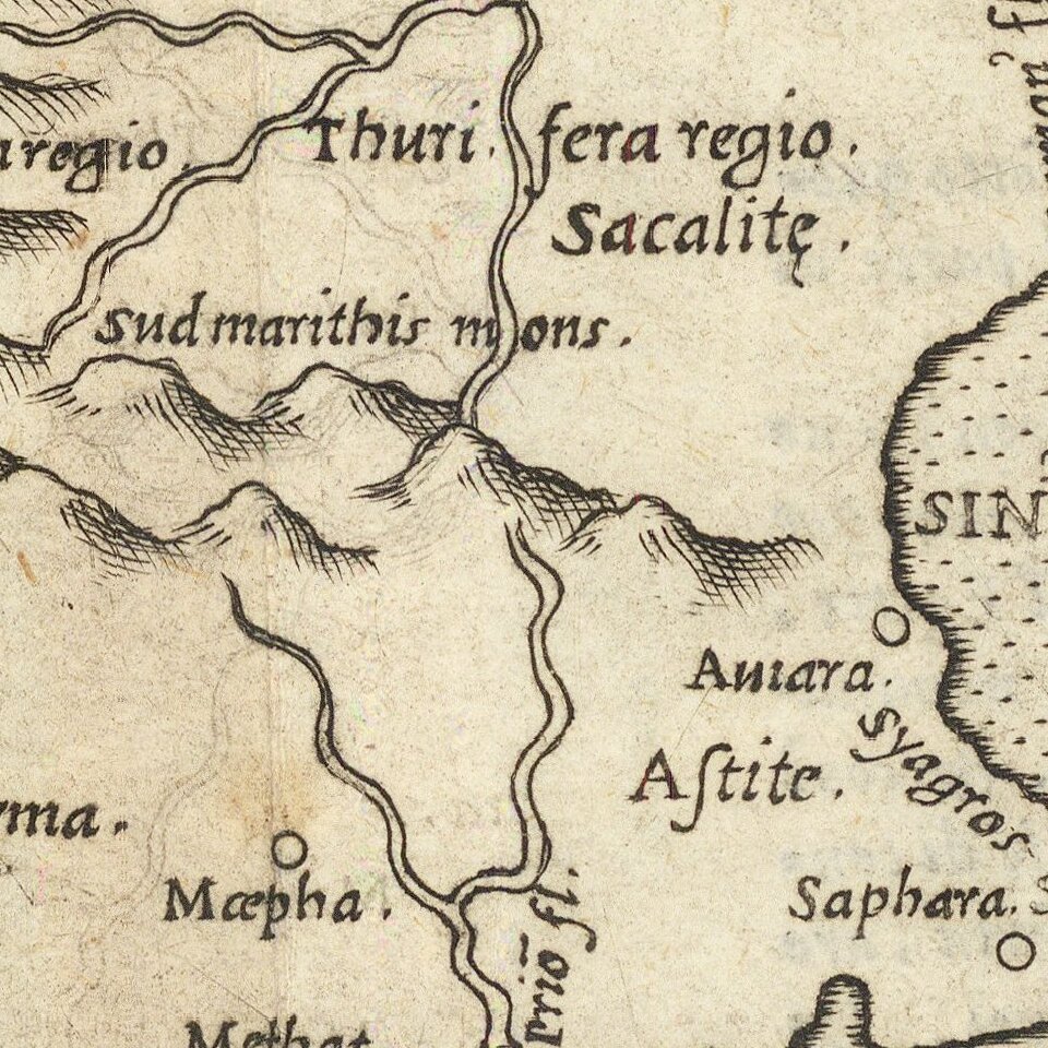 Fine dark impression of Ruscelli's map of the Saudi Peninsula and surrounding waters.