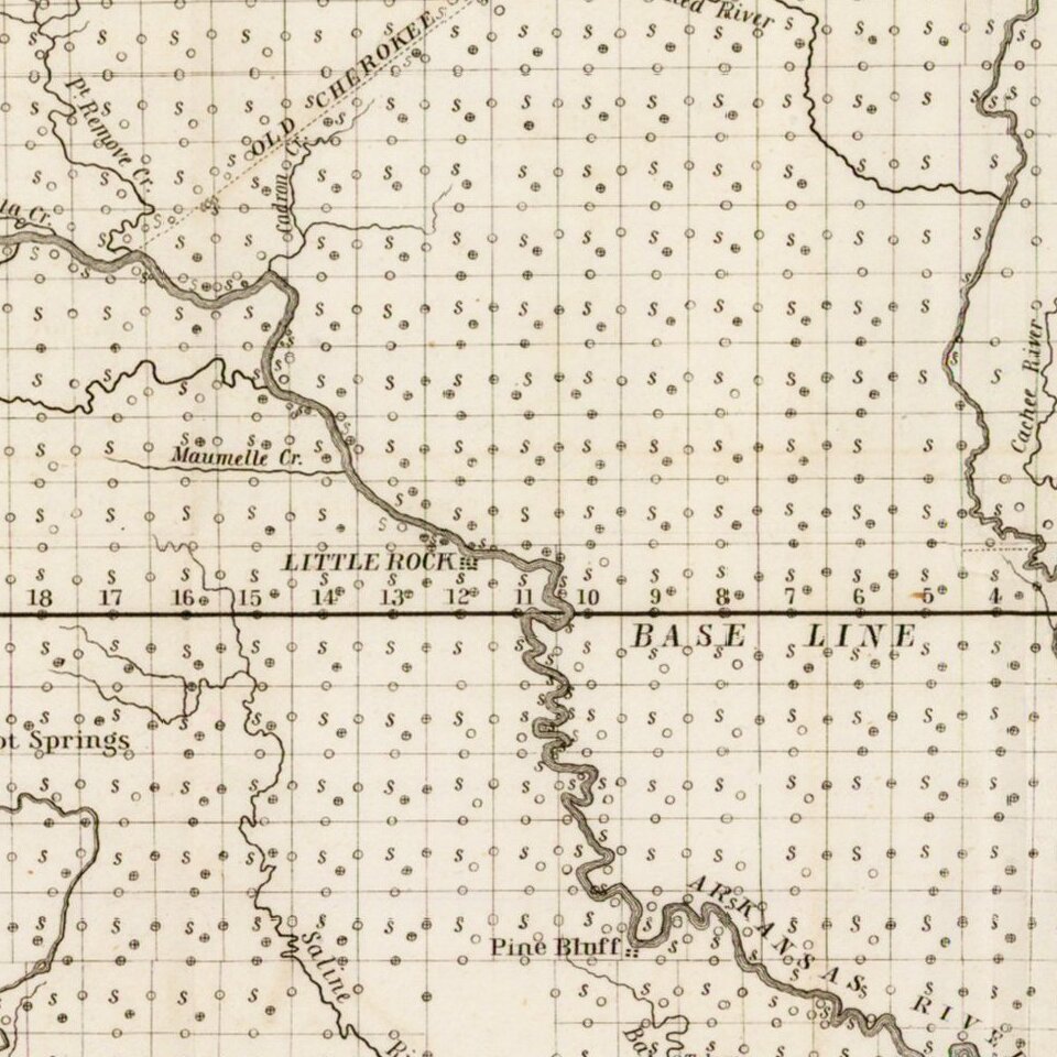 Interesting early survey map of Arkansas, showing the progress of the township survey work through 1844, along with a detailed explanation of the progress of the surveys through September 30, 1844, by William Pelham, the Surveyor General of Arkansas.