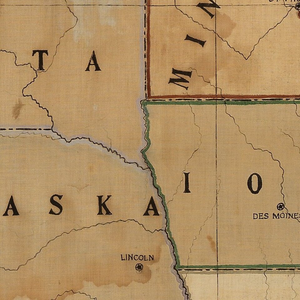 Produced immediately prior to the Armenian Genocide, the scale of the map undoubtedly reflects the overwhelming sense of appreciation for American residency then being felt by its maker. At more than five by six-and-one-half feet, the map is vast but also simple in design, clearly designed to be hung on a wall and viewed at a considerable distance, perhaps in a hallway or auditorium. It depicts the United States and, in less detail, large areas of Canada and Mexico, with little topography other than major bodies of water and river systems. State boundaries are delineated and their capitals identified, including those of Arizona and New Mexico, which had only joined the Union in 1912. Befitting a recent immigrant with his eye on American citizenship, the patriotic title at lower right is executed in an arc of red, white, and blue surrounding a large 48-star flag.
