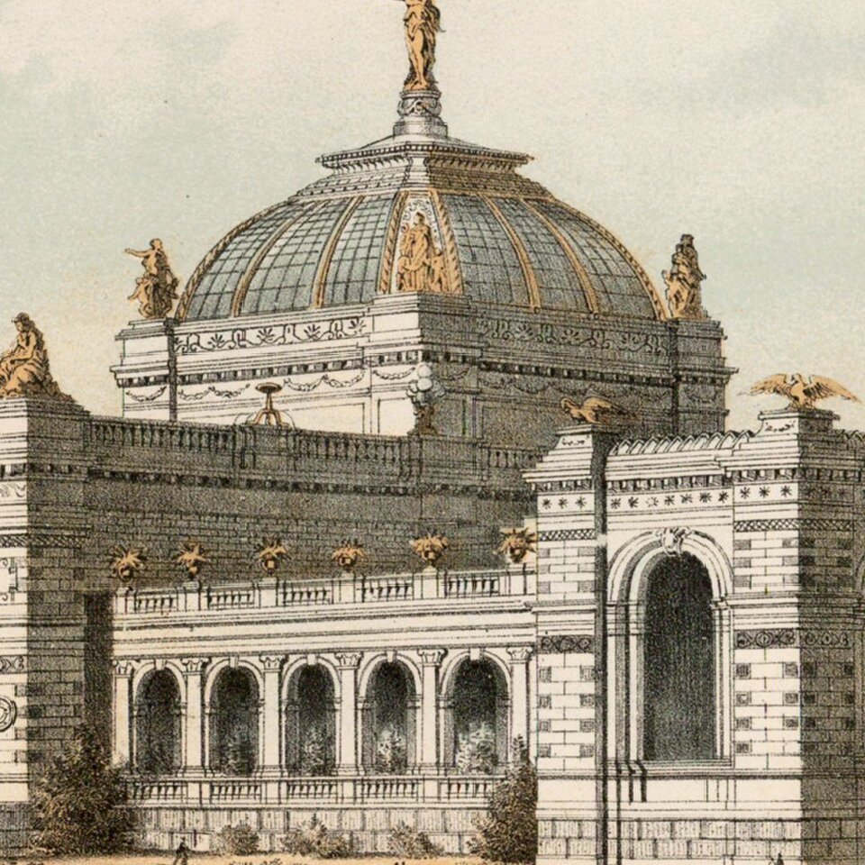 Fine example of Thomas Hunter's view of the Art Gallery, one of the primary exhibition buildings constructed for the 1876 Centennial Exhibition in Philadelphia.
