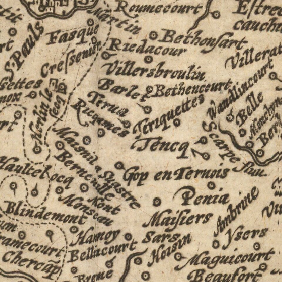 Scarce early map of the Arras region of France. Matthaus Quad was a German cartographer based in Cologne. The map was engraved by Johannes Bussemacher and appeared in several Geographical works published by Quad and Bussemacher at the end of the 16th and beginning of the 17th century.