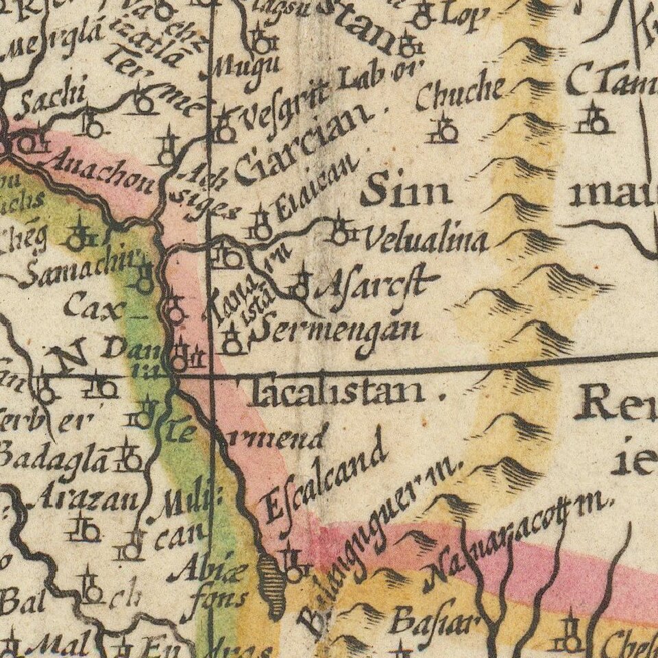 Separating North America (“America Pars”) and Asia is the “Fretium Anian”, or the Strait of Anian. This was a representation of the much-hoped-for Northwest Passage, a still-undiscovered navigable water passage from Europe north to the Pacific. Anian derives from Ania, a Chinese province on a large gulf mentioned in Marco Polo’s travels (ch. 5, book 3). The gulf Polo described was actually the Gulf of Tonkin, but the province’s description was transposed from Vietnam to the northwest coast of North America. The first map to do so was Giacomo Gastaldi’s world map of 1562, followed by Zaltieri and Mercator in 1567. It appeared on maps until the mid-eighteenth century.