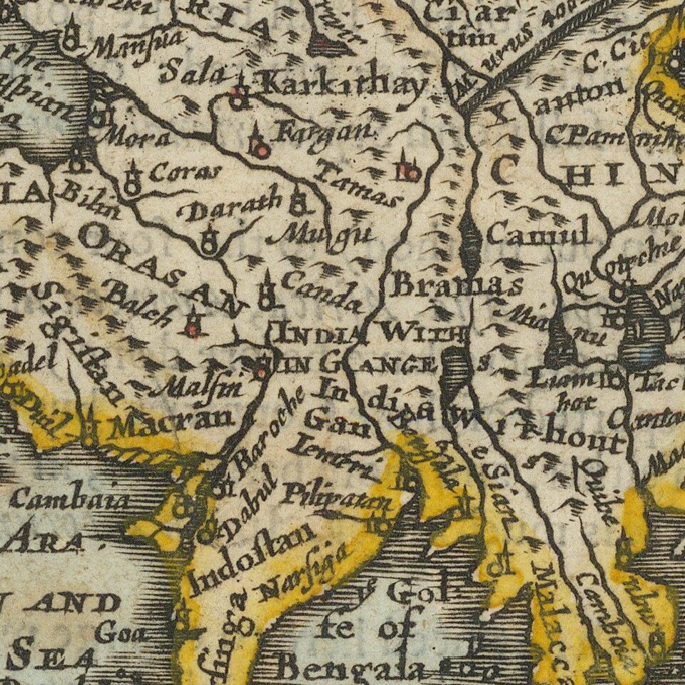 The map shows Corea as an Island, a badly misprojected Japan and a small part of the Great Wall of China. Part of America is shown, as is the Straits of Anian. Fascinating shape for India.