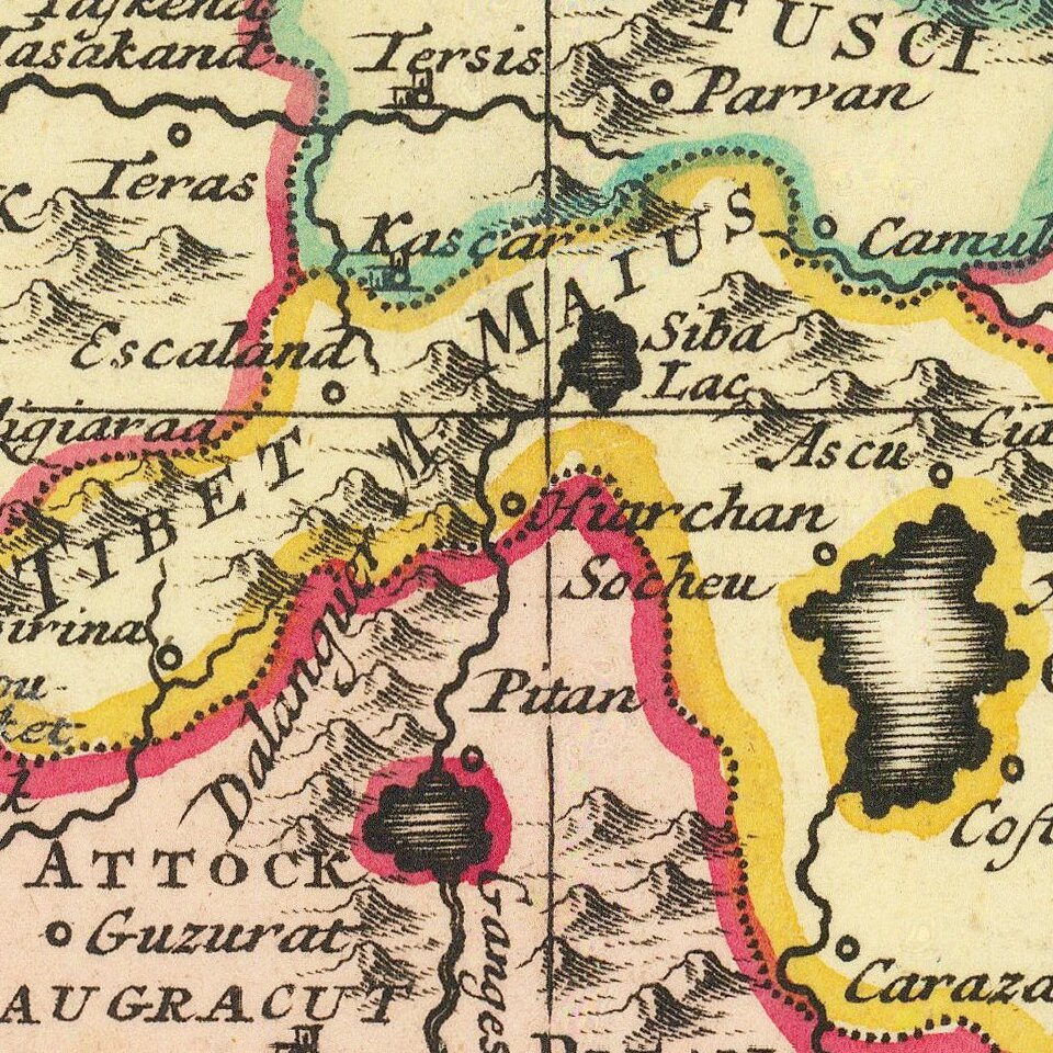 A huge lake appears in Tibet -- the legendary Lake Chiamay. A second lake is shown in the position usually occupied by Lake Chiamay, but here it is named L. Cananor Cimabete.
